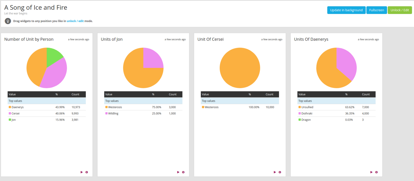 In this Dashboard, you can see that the first widget is a "quick values" widget based on the firstName fields of the logs we retrieved.
