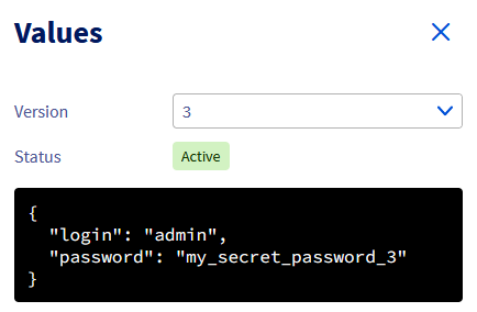 A secret is a collection of one or more key-value pairs grouped within a version. Each modification of a secret creates a new version of that secret, allowing you to go back in the history of changes to the secret.