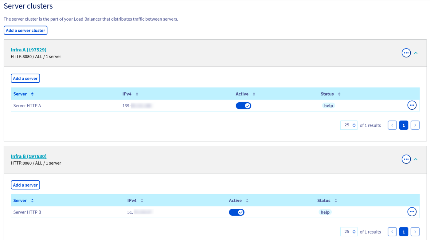 This infrastructure is made up of a server farm that will later be associated with a front-end of your Load Balancer. This farm will expose an HTTP, TCP or UDP service to the front-end. It also balances loads by sending the front-end's incoming traffic to the servers. For more details on the role of the various components of the OVHcloud Load Balancer service, please refer to the following guide: Introduction to the OVHcloud Load Balancer.