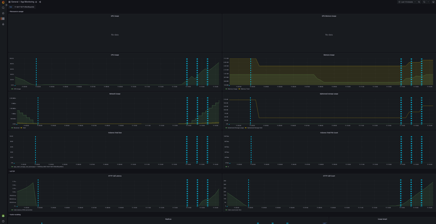 With this dashboard, you can see the percentage of CPU used in real time, the HTTP latency of your API, the autoscaling of the app, network bandwidth and more. Vertical blue bars show scaling events.