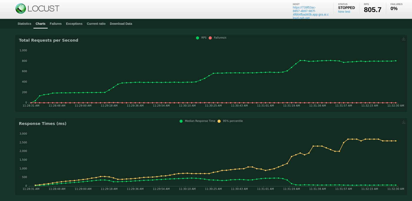 Last point : while Locust is measuring an end-to-end latency (from Locust virtual machine here, to the API model deployed), AI Deploy monitoring is only measuring backbone latency (from the query to the answer). That's why latency values are higher on Locust side, reaching 2.5 seconds.