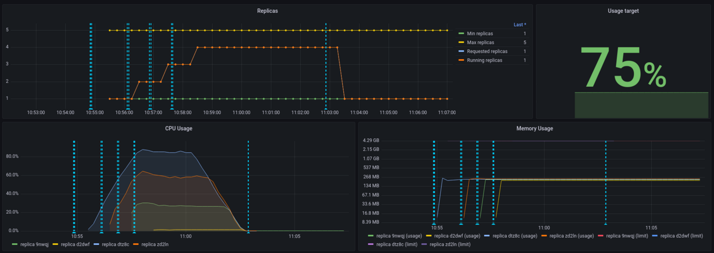 We can see that the threshold has been capped at 75% for the autoscaling and this has been respected. On the 5 replicas provided to the application, 4 have been used.