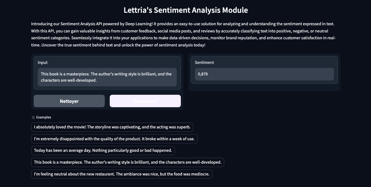Lettria gives you the possibility to analyze the sentiments of a text. The principle is to automatically classify textual data as positive, negative or neutral based on the underlying sentiment expressed in the text.