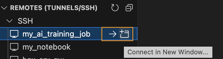 Your resource should now appear in the SSH menu on the left. Connect to it by clicking the arrow next to your resource. VSCode will restart to connect to your remote resource: