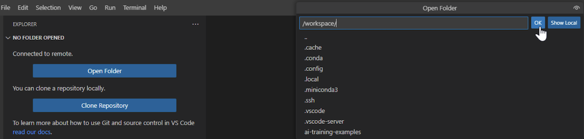 Once connected, you can start developing and running your code in the default /workspace folder, by clicking on the Open folder blue button, and select /workspace.