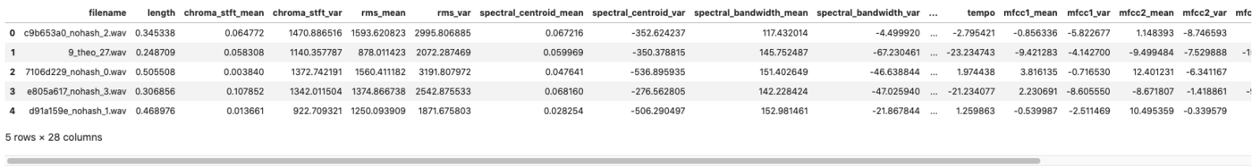 In order to do this, some data processing is required upstream. Each sound will constitute a line of a csv file thanks to its transformation into 26 parameters calculated by Librosa.