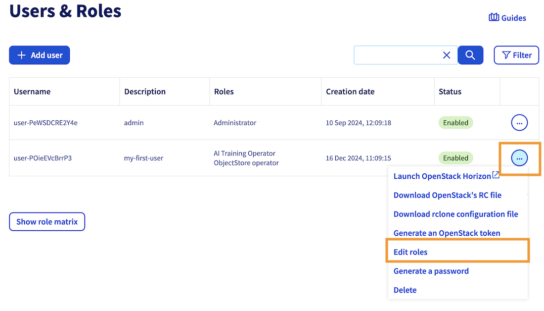 In addition to the AI Training role, we strongly recommend adding the ObjectStore Operator role to your AI users. This role provides read/write access to the OVHcloud Object Storage, which is a persistent storage solution to store your data that is incorporated into our AI Solutions. This way, you can access your data within the AI Solutions.