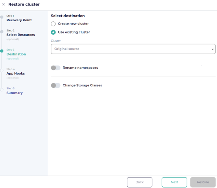On the next step, you can choose an alternate cluster to restore to. By default, the restore will go to the original cluster. You can choose to rename restored namespaces by adding a prefix and/or suffix and change the storage classes if desired.