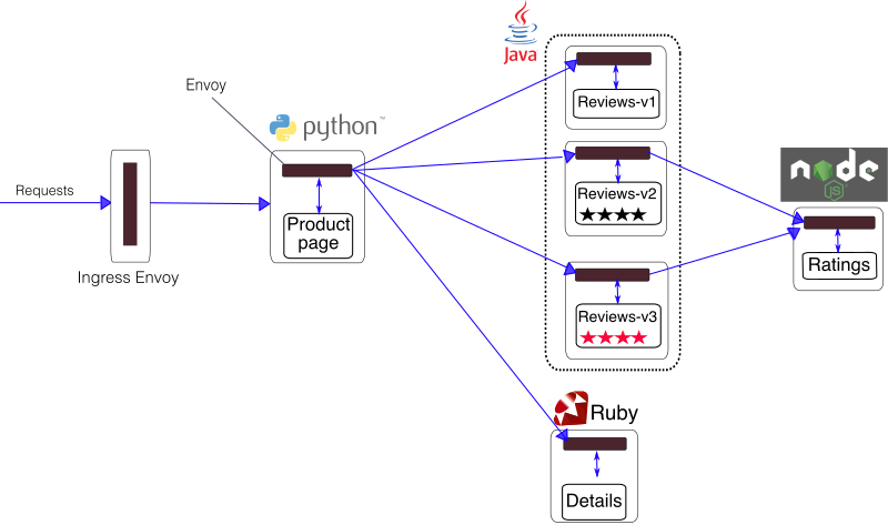 The above command installs and launches, in istio-apps namespace, all four microservices as illustrated in the above diagram: details, productpage, ratings and the three versions of reviews: