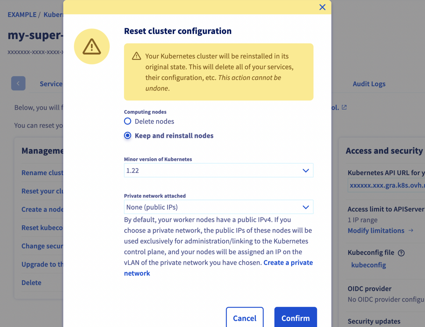 Reset a Kubernetes cluster on the OVHcloud Control Panel
