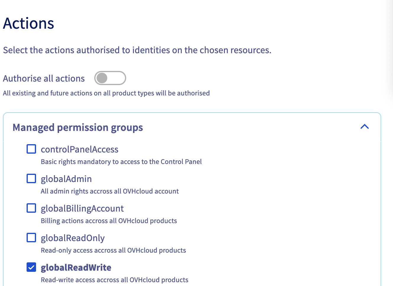 Defining Policies: Assign policies to identities and groups to restrict or grant access. For example, a developer might have permissions to deploy applications but not to manage billing information. This guide defines how to use IAM policies using the OVHcloud Control Panel.