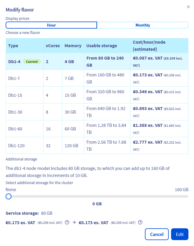 For instance, if you have a PostgreSQL cluster with db1-15 as flavor and less than 384 GB (80% of 480GB) of disk space used, you can decrease the flavor to db1-7 on that endpoint: