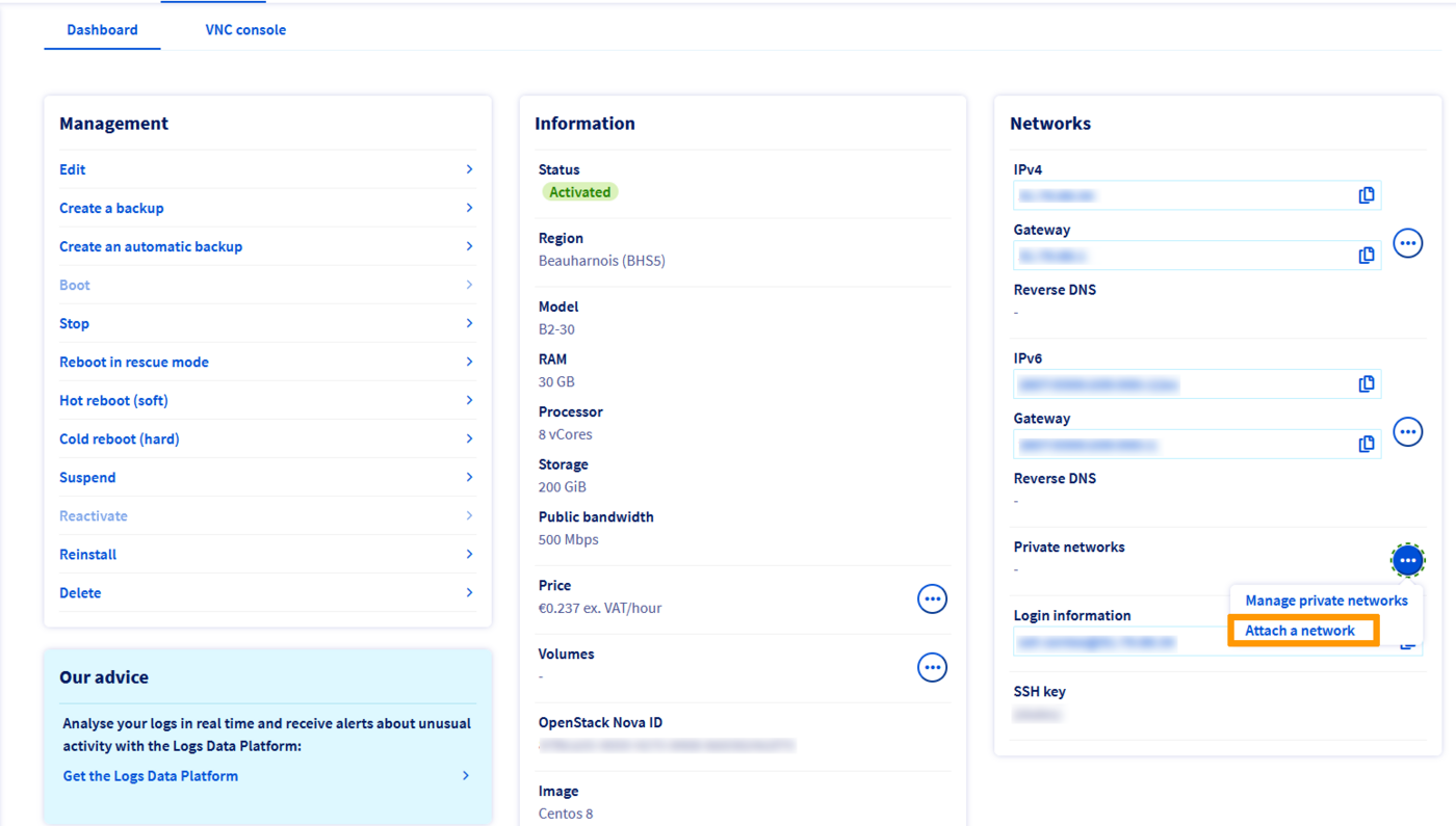 Jeśli chcesz zintegrować istniejącą instancję z vRackiem, nie da się tego zrobić z Panelu klienta OVHcloud. Musisz użyć Horizon, OpenStack API lub APIv6 OVHcloud.