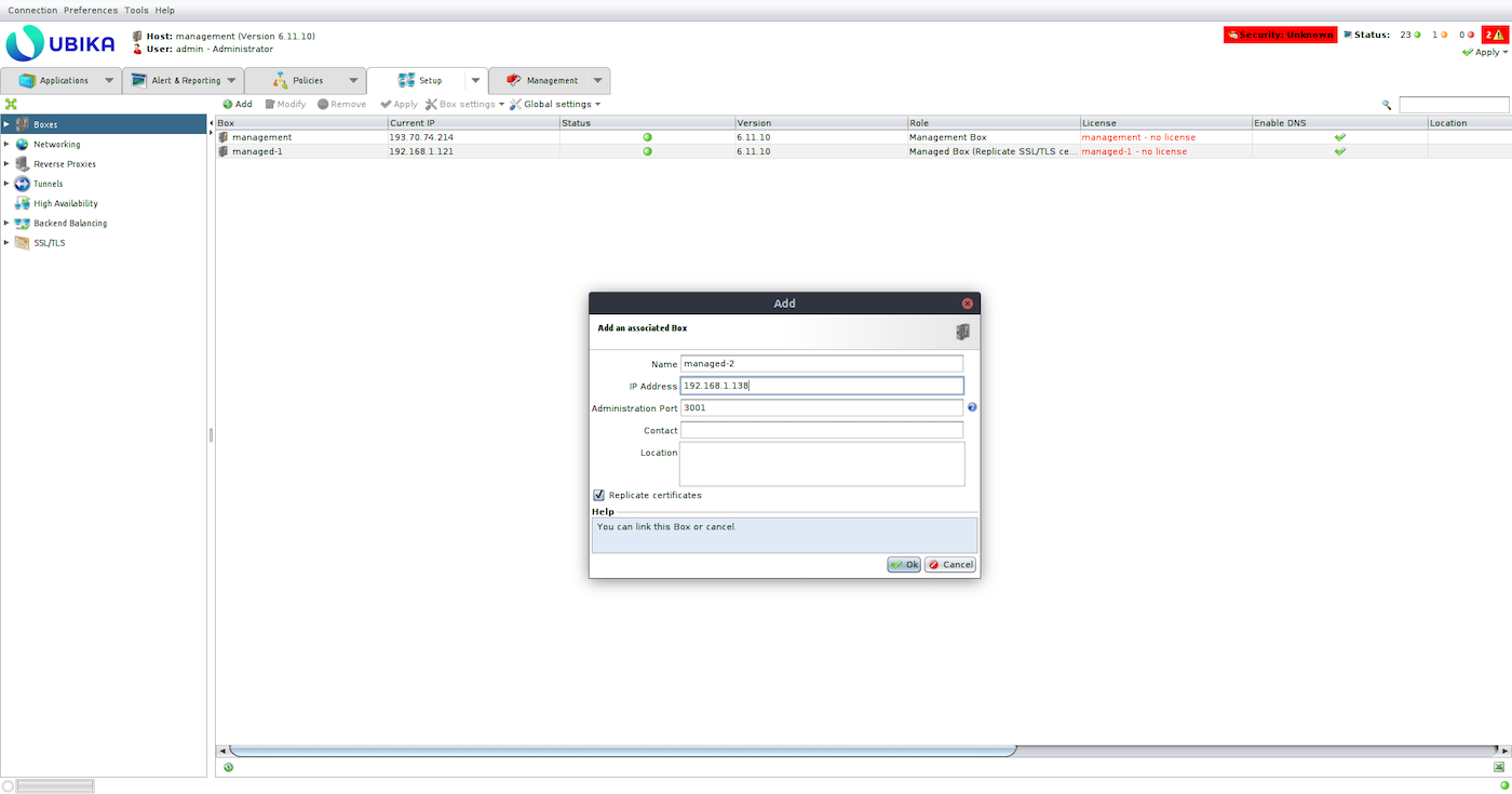 Add the first managed UWG instance to the UWG management (Setup > Boxes > Add):