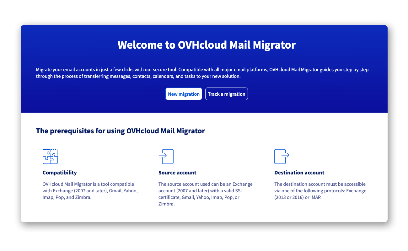 Narzędzie OVHcloud Mail Migrator zostało stworzone przez OVHcloud, aby spełnić potrzebę odwracalności. Umożliwia ono migrację kont e-mailowych do adresów e-mail w OVHcloud lub zewnętrznego usługi poczty e-mail. Proces obsługuje różne typy treści, takie jak wiadomości e-mail, kontakty, kalendarze i zadania, o ile są one kompatybilne z Twoimi adresami e-mail.