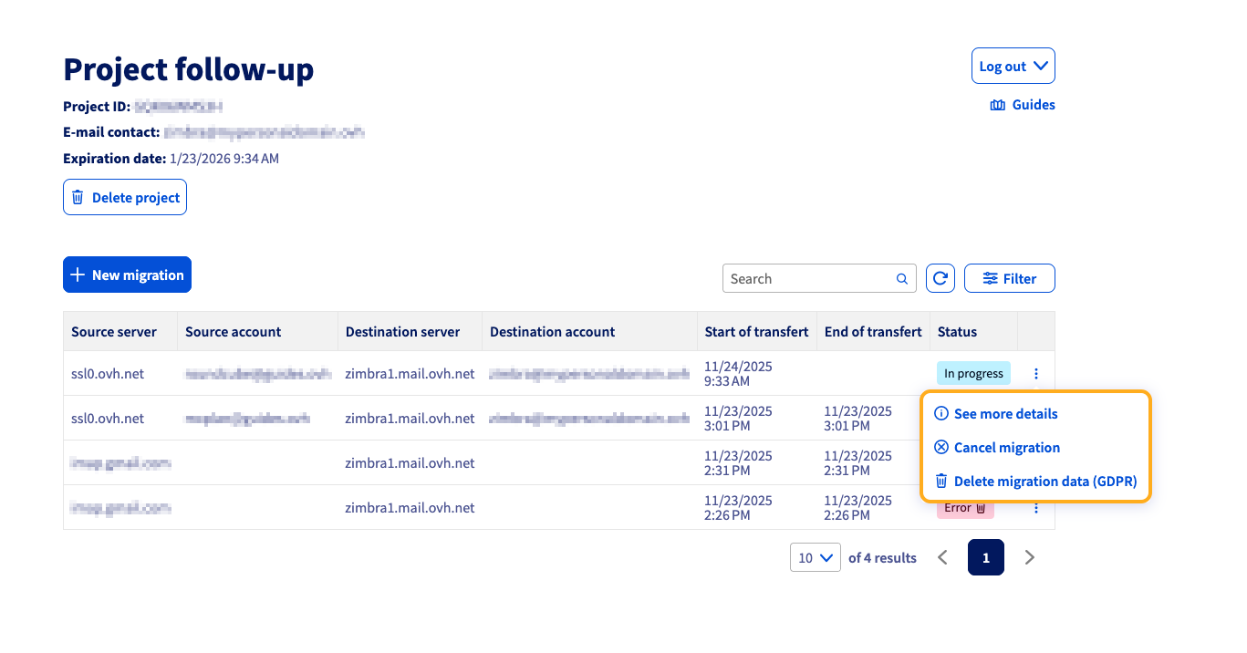 Kliknij przycisk ⋮ po prawej stronie wiersza migracji, aby wyświetlić opcje: