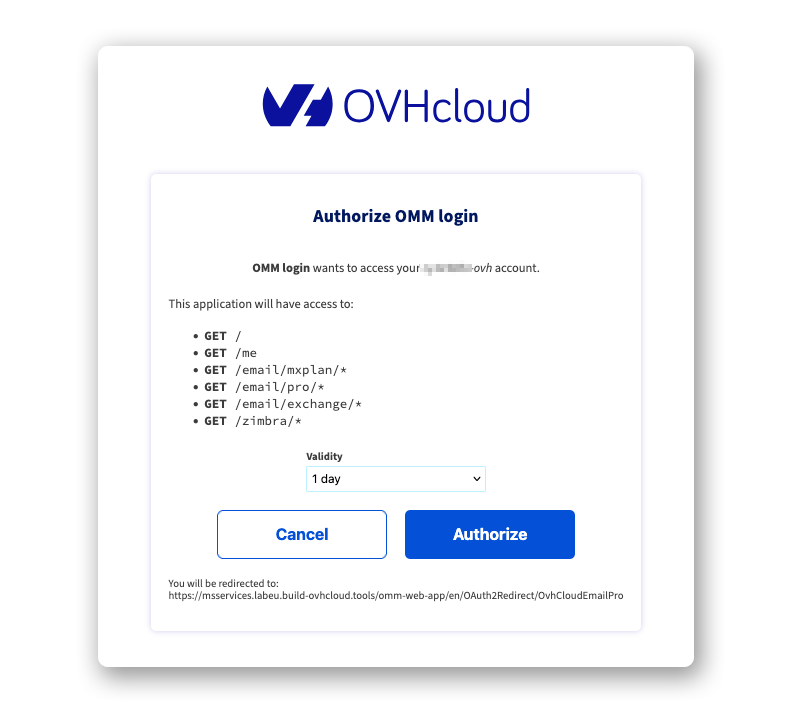 Pojawia się nowe okno. Pozwala ono na udzielenie OMM uprawnień do dostępu do funkcji Twojej strefy klienta, a także na wyświetlenie ofert i kont pocztowych. Domyślnie ważność (Validity) tych uprawnień wynosi 24 godziny (1 dzień). Ustaw okres ważności, który Ci odpowiada, a następnie kliknij Authorize.