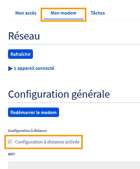 Afin que la configuration du bloc IP puisse s'effectuer en local sur votre box OVHcloud, il est impératif de désactiver la prise en main à distance de celle-ci. Pour cela, toujours depuis votre espace client OVHcloud sur l'accès à Internet concerné, positionnez-vous sur l'onglet Mon modem.
