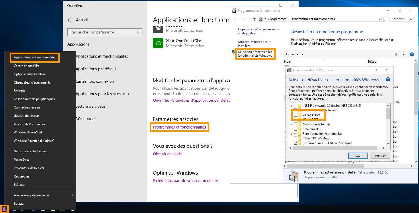Pour l'activer sur Windows 10, effectuez un clic droit sur l'image en bas à gauche représentant le logo Windows et cliquez sur Applications et fonctionnalités. Descendez en bas de la fenêtre qui apparaît et cliquez sur Programmes et fonctionnalités. Sélectionnez ensuite Activer ou désactiver des fonctionnalités Windows, puis assurez-vous de cocher la case à côté de Client Telnet. Validez en cliquant sur le bouton OK.