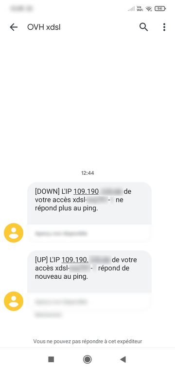 Les SMS vous prévenant de l'injoignabilité de votre accès à Internet, ou de son rétablissement, se présentent sous la forme suivante :