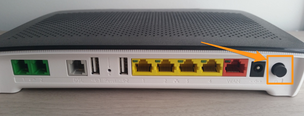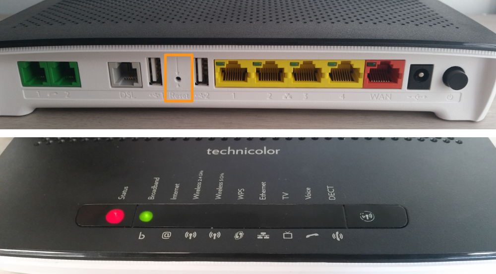 Débranchez tous les câbles de type RJ45 (les ports jaunes sur la photo ci-dessous). Puis appuyez dans le trou reset (à l'aide d'un objet pointu) pendant au moins 10 secondes. Attendez alors, tout en maintenant ce bouton, que le voyant Power commence à clignoter. Dès que cela sera le cas, vous pourrez relâcher.