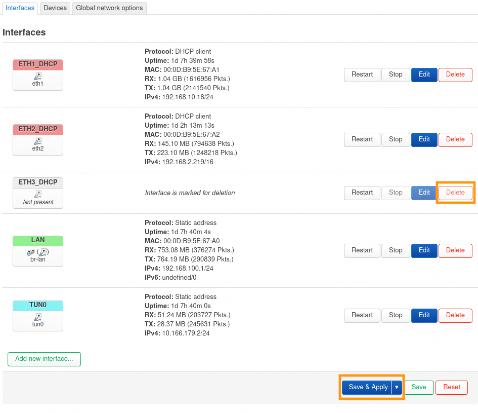 Supprimez l'interface que vous souhaitez ajouter au LAN avec le bouton Delete, dans notre exemple eth3_dhcp.