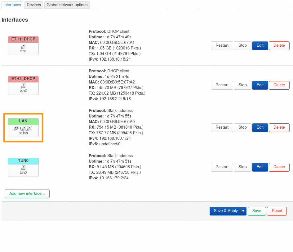 Modifiez le bridge br-lan à l'aide du bouton Configure....