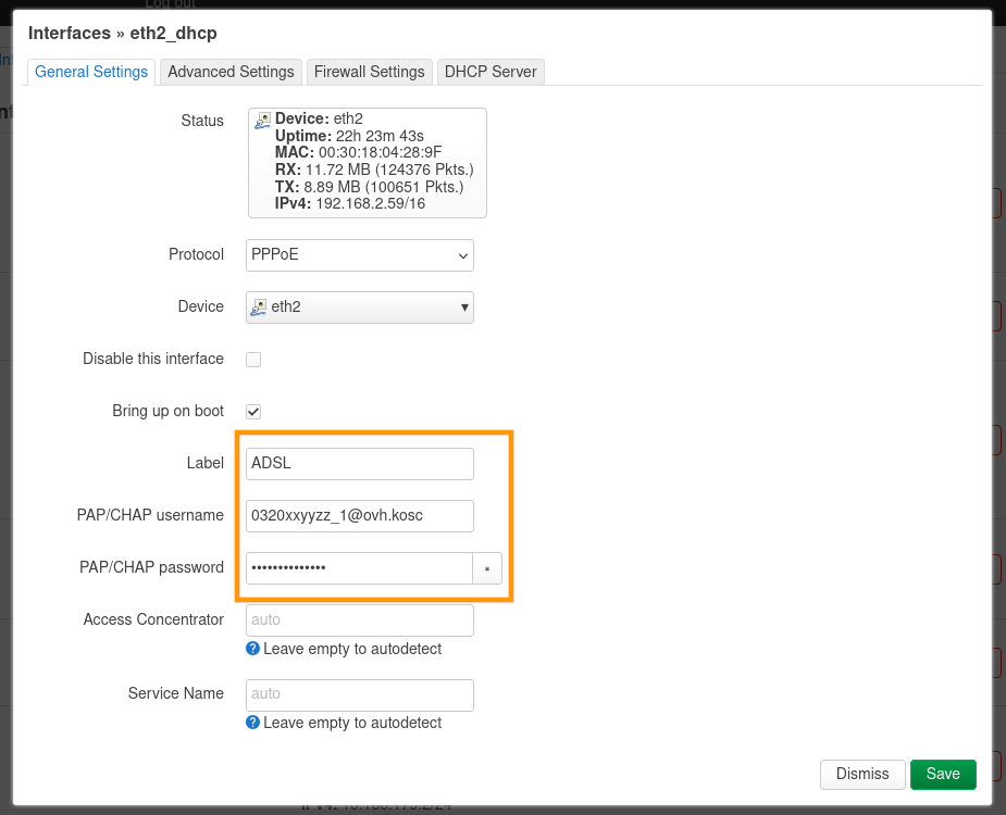 Dans le paramètre PAP/CHAP username, renseignez votre nom d'utilisateur PPP. Pour notre exemple, 0320xxyyzz_1@ovh.kosc.
