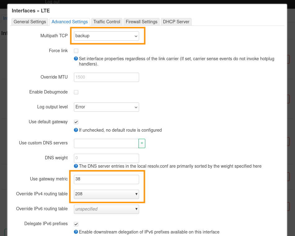 Pour la création manuelle d'une interface WAN, consultez l'étape 3 de la section « Configurer une interface en 4G », en particulier les paramètres de la section Advanced Settings et Firewall.
