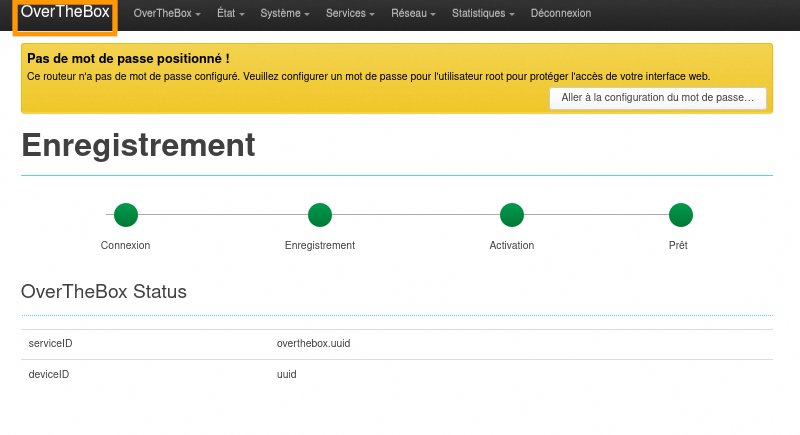 L'enregistrement est terminé et votre offre est désormais activée. Pour revenir à la page d'accueil, cliquez sur OverTheBox en haut à gauche de l'interface.