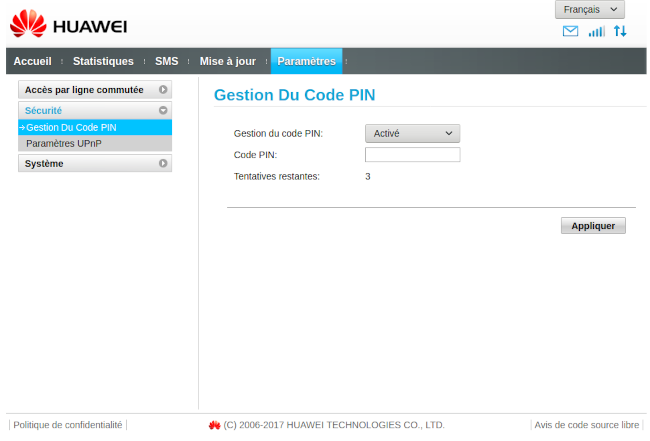 Une fois connecté, accédez au menu Paramètres puis, dans le menu Gestion Du Code PIN, entrez le code PIN de votre carte SIM.