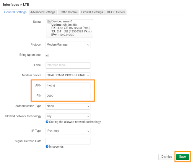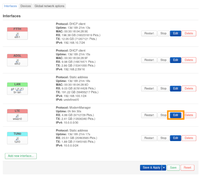 Puis sélectionnez le bouton Edit pour l'interface LTE.