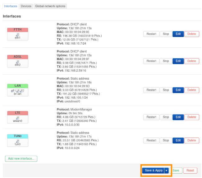 Les liens mobiles sont souvent associés à des quotas de données. Si vous souhaitez limiter l'utilisation du lien pour que l'agrégation se fasse seulement en cas de souci sur le lien principal, il est possible de modifier le comportement de l'agrégation. Changer le comportement est également recommandé en cas de différence importante entre le débit de l'interface 4G et celui du lien principal (par exemple dans une configuration avec un lien fibre à 1Gbps et un lien 4G à 15Mbps).