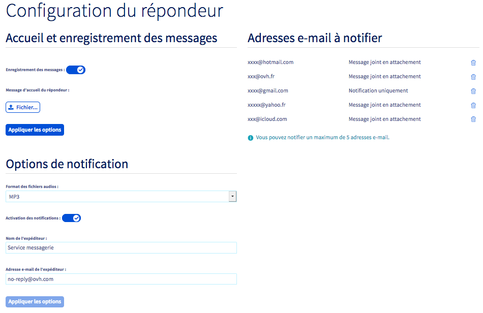 Vous avez aussi la possibilité de renseigner jusqu'à 5 adresses e-mail de notification, sur lesquelles vous pourrez également recevoir les messages. Il est possible de définir différents formats audio.