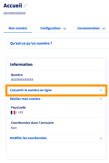 Depuis votre espace client OVHcloud, sélectionnez votre numéro alias. Dans l'onglet Gestion, cliquez sur Convertir le numéro en ligne.