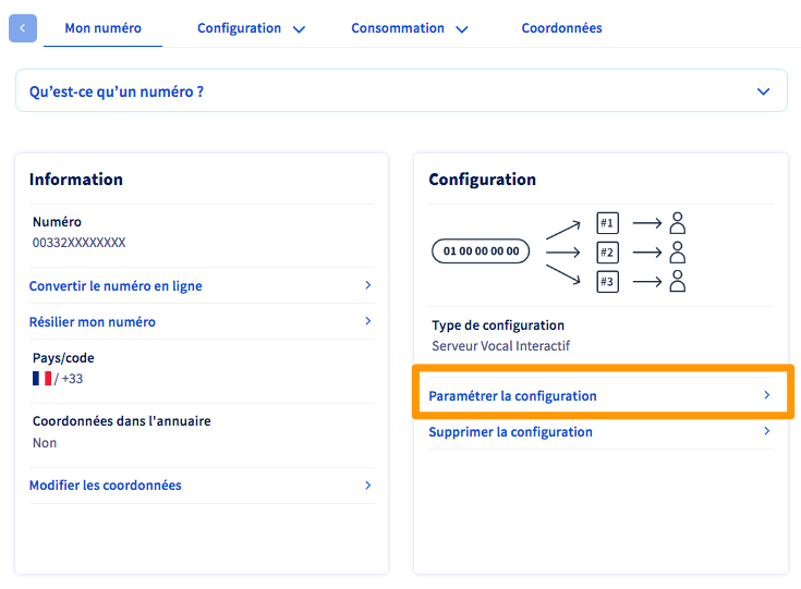 Assurez-vous que le numéro est bien configuré en tant que « Serveur Vocal Interactif », en vérifiant son Type de configuration dans le cadre « Configuration ». Dès lors, deux possibilités :