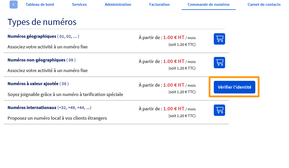 Vous accédez alors aux différents types de numéros. Cliquez sur Vérifier l'identité en face de « Numéros à valeur ajoutée ».