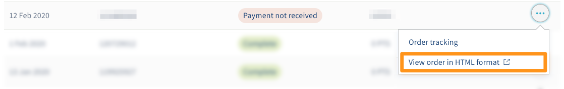 Poderá igualmente visualizar a nota de encomenda em formato HTML, clicando em ... à direita da sua encomenda e depois em Ver encomenda em formato HTML.