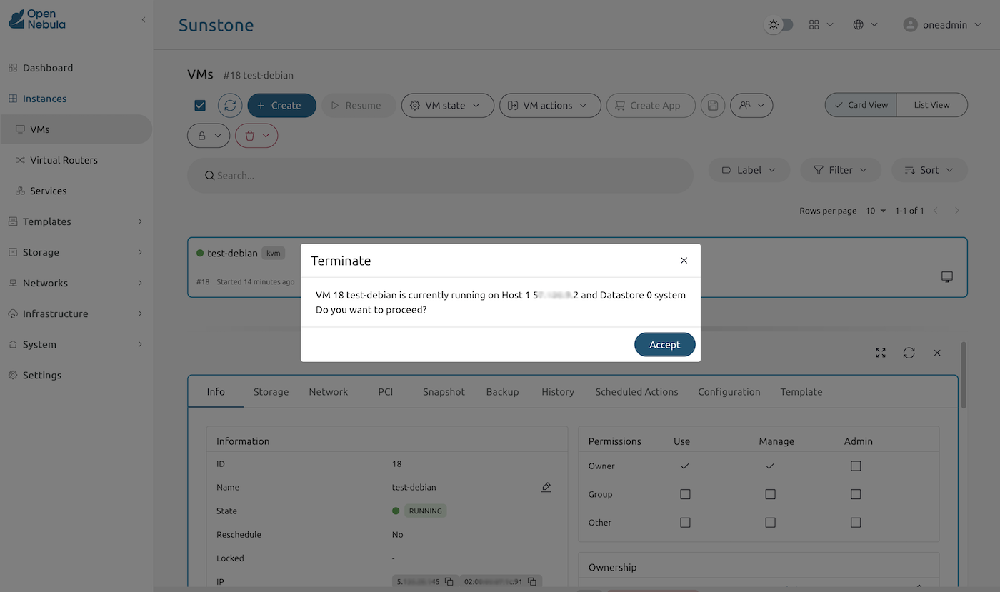 The following section explains how to access a Hosted OpenNebula Cloud Deployment via the web UI, and instantiate and access a virtual machine.