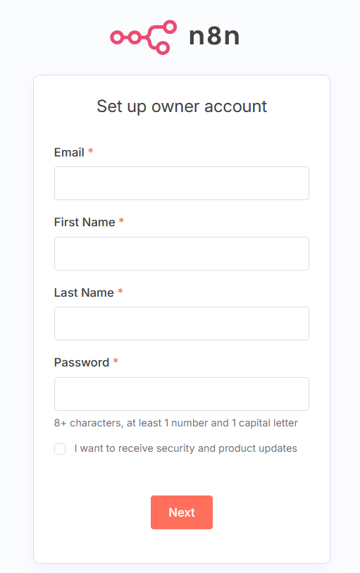 A form for creating an account will appear. Complete it to configure the first admin user of your n8n instance.