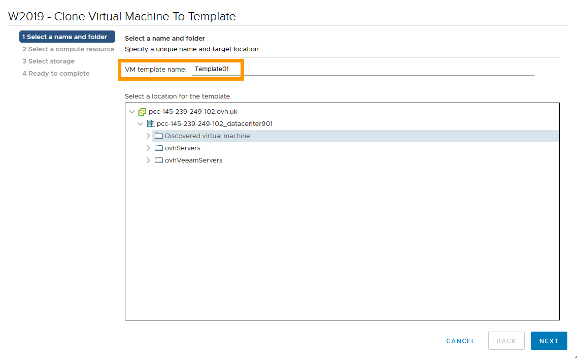 Name the template VM and select its datacenter location.
