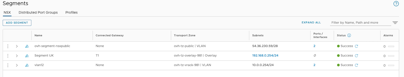 4. Verify that your two interfaces are created and that their status is in Success (section Tier-0 Gateway).