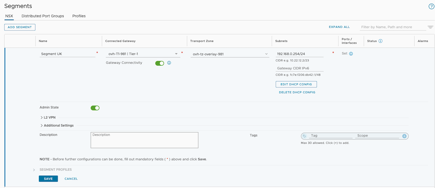 Create an overlay segment in the location where we plan to deploy our virtual machine. Use 172.16.0.254 (DE) or 192.168.0.254 (UK) as the gateway IP address on this segment. Optionally, configure a DHCP server to simplify deployment, although this is not required. Please note that we are currently connecting our segment to the ovh-T1-gw T1, but this configuration will be modified later.