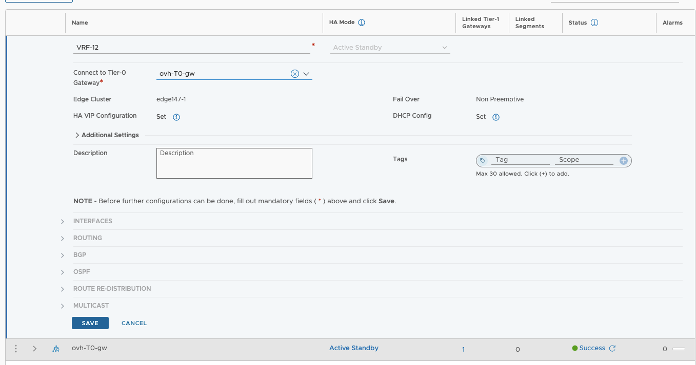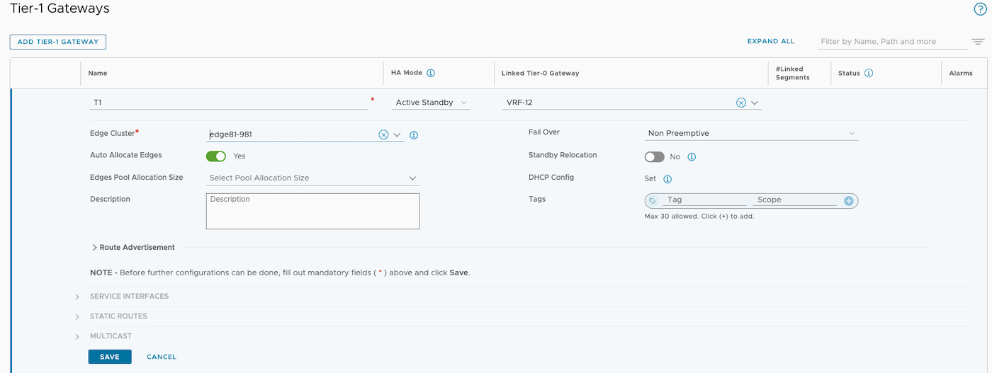 In the Tier-1 Gateways > Add Tier-1 Gateway section, create a new T1 gateway. Choose a name that suits your needs, then connect it to the VRF you have created and finally, connect it to your Edge cluster.