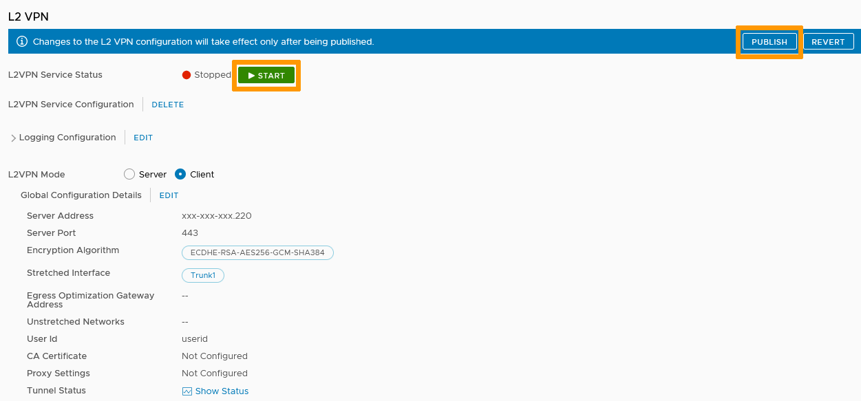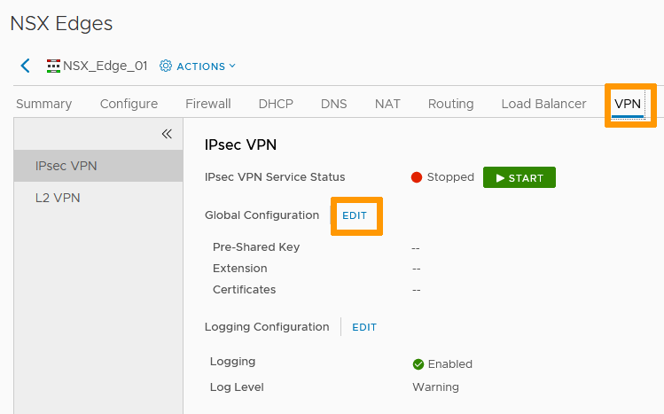 On the client NSX, in the L2 VPN section, select Client mode then click on the Edit button next to Global Configuration Details.