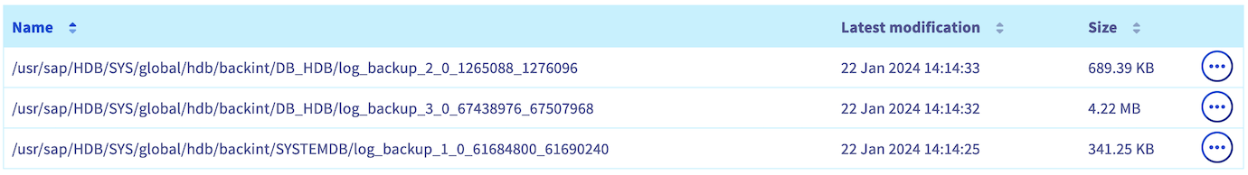 Two files named log_backup_0_0_0_0 and which have DB_<SID> and SYSTEMDB prefixes are also present in your first Object Storage bucket. These files correspond to backups of the SAP HANA backup catalog, allowing you to list backups known by SAP HANA.