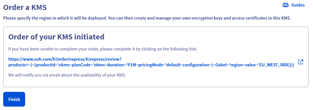 You can order a KMS from the OVHcloud Control Panel by going to Identity, Security & Operations and Key Management Service. Then click the Order a KMS button.