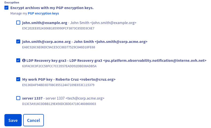 To avoid such a situation, we provide the LDP Recovery Keys. These are also PGP public keys you can use in your cold storage configuration, but which private keys are owned by OVHcloud. Thus if you chose to use LDP Recovery Keys in addition to your own keys, and you lose access to your private keys, OVHcloud teams will still be able to decrypt your archives, re-encrypt it with your new keys and send you these re-encrypted archives.
