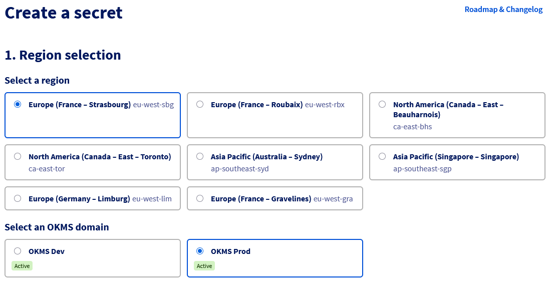 In the case where at least two OKMS domains are already present in a region, an additional selection step appears when creating a secret.