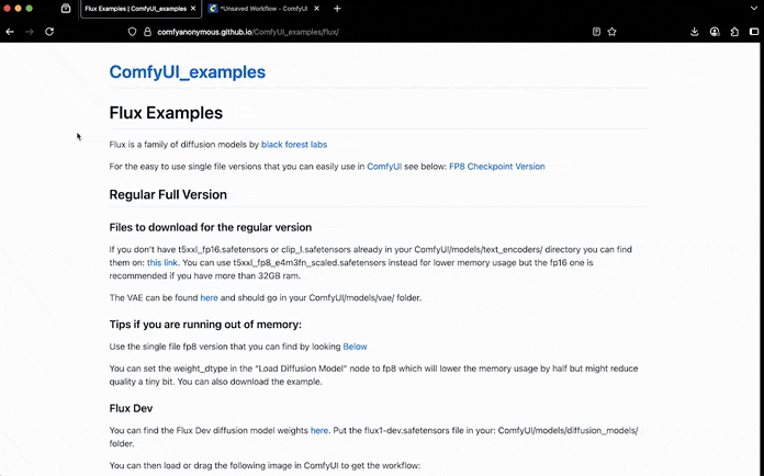 Once inside the ComfyUI web interface, head to the official ComfyUI FLUX examples page. Find the image matching your deployed variant.